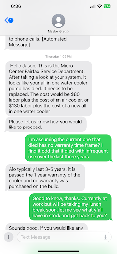 Read moreSo normally I’m down with this place. Really solid selection/stock, and the employees are generally pretty helpful and you can count on them to check in on you pretty frequently to make sure you’re doing alright. Problem is it really seems to be all about making a sale more than making sure someone is well taken care of. I dropped my PC off last Monday for diagnostic on what I was thinking is a failing AIO CPU cooler. Check in was pretty smooth, they did an initial test on the bench while I was there to see what I was talking about. Upon confirming that the CPU temps were climbing with no drop or plateau (for lack of a better term), they checked it in for diag. Sweet, no problem. Paid the diag fee and went on my way waiting to hear from them having been given a week timeframe on when to expect some form of response (again, no problem). This is where I start to scratch my head and ultimately get annoyed and frustrated. I hear back from the technician doing the diagnostics saying that “it looks like your water cooler pump has died. It needs to be replaced.” Which I find weird as I felt the coolant being pumped through the unit, with one pipe being warm and the other being cool along with the fact that the PC has been used pretty sparingly over the last three years. But I’m a powersports technician, not a PC tech so I asked if there was any warranty on the product and mentioned my confusion on it going bad with so little use to it. The response I got was as follows, “Aio typically last 3-5 years, it is passed the 1 year warranty of the cooler and no warranty was purchased on the build.” Which, at the time I thought was no big deal. I discuss options with the technician but ultimately decide to just pick up and explore more options to fix as at this time I can’t constitute paying upwards of $450-500 for new part and labor, which labor rates are a bit wild in my opinion. They’re about on par with auto shop labor rates, but whatever, it’s a business and they need to make their money too. Fast forward to today, I go in to pick up my tower. Pickup was smooth, the guy in the service area friendly and quick with helping get me squared away. I go to look at what was in stock for different cooling systems. I find a couple that I’m curious about and go ahead and pick one to go verify if it is compatible with what I already have. One thing I noticed, though, that made me wonder was that most had listed a 5 or even 6 year manufacturer’s warranty on the box. So I ask the sales man in that department if they have access to purchase history as I want to make sure of a couple things. One, what did the AIO I purchased three years ago come with as a warranty and two, would the one I found be compatible with the CPU I purchased at the same time. We verified that what I had purchased came with a 5 year warranty on parts AND labor. Upon seeing that, I then ask about how I could get that covered to which the sales guy pushed it off as “You didn’t buy our warranty package, you’ll have to take it direct to the manufacturer,” and proceeded to worry about putting his barcode stickers on the two items I had in my cart while brushing off my follow up questions. At this rate I’m pretty upset as I would’ve thought that, one, I would’ve been told by the service tech about the physical part having a five year warranty (not whatever this phantom 1 year cooler warranty they had mentioned) and two, that since the warranty from Lian Li covers both parts AND LABOR, why would they not be reaching out to Lian Li to figure out a solution. Why should I, as the consumer, have to become the communicator to get this covered when it’s pretty apparent to me that the manufacturer will cover everything involved and Micro Center will still manage to get their cut out of this without it being any cost to myself as it is still well within the warranty time frame. I’ve now wasted a week of my time and now have to figure out how to get the AIO warrantied and be without a working PC for a longer timeframe than...