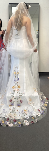 This was my first time going dress shopping so I didn't quite know what to expect, but I was blown away! Kelly was the consultant that helped me out through my appointment and boy did I make her WORK. I explained to her that I am having two weddings, so I am shopping for two different dresses. One wedding is going to be in a catholic church and the other is going to be on a beach in Cancun, so two very different vibes. I told her my goal budget, which she was extremely respectful of and was pulling dresses in that budget. I also had told her that I'm okay with going above that if I find one that I love.