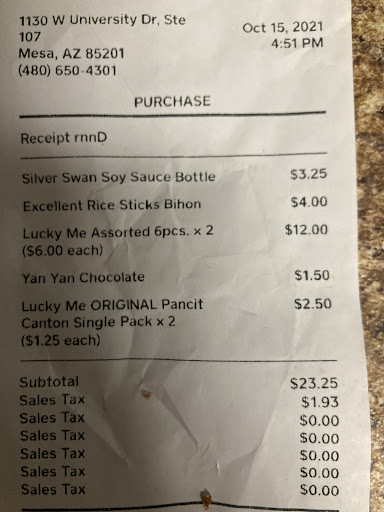 I went inside the store trying to find something very simple... "Lucky me" "Pancit Canton". Normally you can buy three for a dollar or $0.33 at Seafood City in California. So, here in Phoenix I expected to pay $0.45 to $0.50 per piece. What to my surprise should appear... is old stock of lucky me at $1.65 per piece. How could they rip off their fellow countrymen who are looking for this little treat to find a taste of home. I opened up the subject with the one who appeared to be the owner or manager of the store. She said she was from Taguig Manila and that she was not greedy. Then offered me a 10% discount, but no more. I declined and decided not to buy even one piece. It's unforgivable. Don't go to this store. I will assume that all things in this place are triple the value that they actually should be sold at. They are greedy and should not be allowed to thrive. Hopefully their store will close someday and another group will come in who is more in the know of how to treat their fellow countrymen from the Philippines. "Terrible!"
