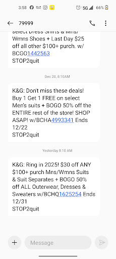 Ā Ā Ā Read moreI would NEVER visit this location AGAIN !!!! I shop at K&G all the time and I get text messages about the deals. I so happened to be on this side of town and on my lunch break decided to do some shopping. I picked up 4 sweaters all of which was 29.99 except for one which was 24.99. At check out I seen they all rung up for 29.99 and I told the associate one was for 24.99. There and behold it clearly said 24.99 but she stated oh That's not the right price and asked do I still want it. I stated to her are you not going to honor the 24.99 on the sticker??? She repeated That's not the right price do you still want it or I can take it off. So at this point I I dont want any of the merchandise and now you guys lost a 100+ sale, I wont be returning to this location and this negative review over $5...