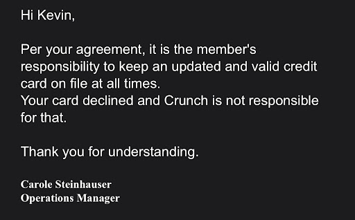 Her language and dialogue with myself was absolutely inappropriate and unnecessary. I was hung up on twice after I asked for two day trial… (As I would be interested in two classes before committing to Crunch) I was constantly talked over, and then laughed at over the phone… I was also rushed and told “I have people in front of me”; as if I needed to be rushed on the questions of the classes and benefits of Crunch.. It is completely OUTRAGEOUS to rush a potential customer for inquiring.. Wouldn’t you agree Anthony?? I was then lied to about the benefits and offers within the company at this time, as I had to double check online while on the phone with Aria and explain all you had on the website, and once I made this clear Aria then retracted. Aria CLEARLY needs more training on the business, the memberships and what it entails, the offers you hold months and MOST IMPORTANTLY How to speak to potential customers and phone etiquette in general.