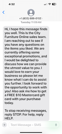 Read moreCity furniture contacted me on Tuesday January the 13th with this message. I had made a purchase on Sunday the 11th they were suppose to gifted me the gift card through my sale associates call him today after the 24/48 hours they promise me. He inform me that no one had contacted him so I called customer service wasted 30 minutes of my time to tell me it’s to go and try some mattresses. So I decided to disconnect the call and make this complaint online about this offer the online sale teams. This is false advertisement as it...