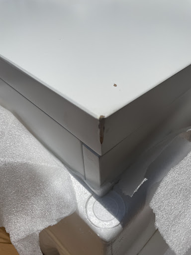Fourth delivery was the new glass top and base for the new dining set and the chairs were on back order so I had to wait another month or so. Not to my surprise the base was damaged.