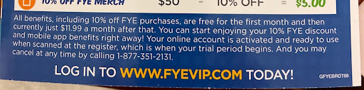 Iâve never had any issues with FYE until my last visit. Iâm still giving 3 stars because it wasnât a completely insane experience or anything, however they encourage you to sign up for their âFYE backstage passâ but do not provide much detail when doing so. Therefore I figured it was like a rewards card offered by many other stores and accepted. Turns out only the first month is free and then your bank is auto charged (using whatever card you used with your purchase during that visit) every month after for about $12.00 month. ... meaning I ended up paying about $30 ultimately, for a dang can of Pepsi and some candy for my son! Then you have to call to cancel and they attempt to pressure you into keeping your membership .. I told the rep I hardly ever shop here it wouldnât be worth it and she says I can reduce the price to $6 a month... why would I donate $6 a month to your chain of retail stores when I rarely...almost never shop there? Finally they did cancel it though... at least I hope. Just wanted to give a heads up to anyone who reads and may shop here on a rare occasion, donât accept their...