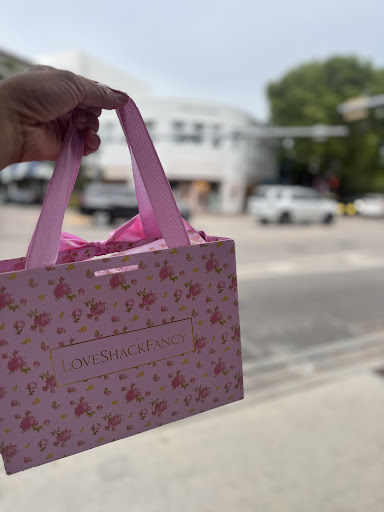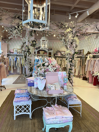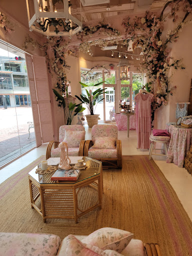 Love Shack Fancy stores are very romantic and charming. Each store is influenced by its location and this Miami store reflects Art Deco design and they carry printed pillows in a Coconut Grove pattern. The Coconut Grove store opened on October 23rd and the outside is wreathed in pink blooms. Inside the store, pink is the predominant color of the women and girls clothing and home goods which include wallpaper and bedding. The store sells the LoveShackFancy brand, Zingara Vintage, and collaborations like LoveShackFancy x Beach Riot. Everything is very floral, pastel, and girly, think a garden party with the Queen or Elle Woods from legally Blonde. The LoveShackFancy brand is known for its hand dyed fabrics and floral prints.