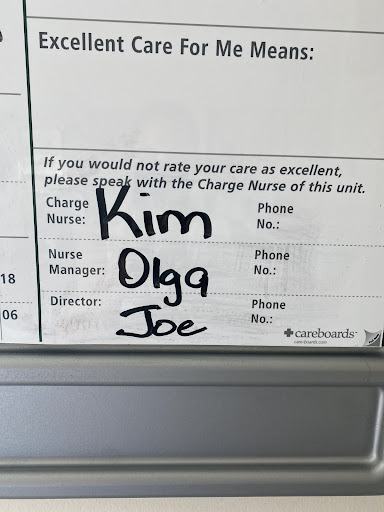 Read moreToday my mother was supposed to be discharged before 4pm. I have been waiting since 4pm for her to be allowed to leave and it is already 5:45pm while Iâm writing this and I am still waiting for her âhospital mandatedâ wheelchair ride down to the lobby. While waiting, earlier I found a nurse in a room down the hall relaxing in a patients recliner, practically asleep. Multiple help alerts blinking at the doors and 5 nurses hanging out in the round section of their front desk. I will admit I am quite upset at this point and have already tried getting ahold of a manager on duty for this PH28 north tower floor but apparently weekends are free of managers, so of course itâs a free for all here with staffâŚ.This is not our first time here. My mom has stage four colon cancer and has come here for over 15years with her multiple cancers over the past and I can assure you 4-5hour wait for discharge after âsaying the papers are being prepared nowâ is ridiculous for a Saturday where honestly there isnât much going on. Iâve seen this hospital busy and today looks like a ghost town in comparison. If a manager is reading this. PLEASE reach back out. I would love to give details on this experience for better training purposes, or however companies and facilities like to word itâŚ.lol one of the nurses Kassandra just came in giving a funny excuse that she thought my mom wanted to wait for a result before being discharged. Funny thing is, My mom told the doctor at 10am she wished to be discharged without the results. The doctor didnât put the request in until around 2pm and now apparently never told the nurses or wrote down that we didnât want the results. So they have had us here for nothing. Mind you, through all this time both she and I have been telling everyone that will listen that we are waiting on the papersâŚ. I donât understand how this is happening right nowâŚ. Will try and get more photos before I leave, should have gotten one of the nurse sleeping as proof lol đ¤Śââď¸ But here is the nurses she had today, unless they didnât change the writing. Now that I think about it, kassandra wasnât even assigned to my mom based on the board, so why is she coming up with excuses? Guess it wasnât...