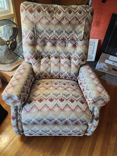 Read moreA to Z did a fantastic job! They paid great attention to detail, centering the pattern in my fabric. You can see how it's lined up from the footrest to the arm covers and across the back. The head cover is misaligned because I sat already. They let me bring my own fabric which saved me a bunch (some uphosterers insist that you buy from them). A to Z had the best price and were willing to do a recliner (not every shop does). One reviewer mentioned smoke smell but that's out back where some workers take breaks, the shop is clean. Speaking of that, A to Z had the cleanest, best organized shop I've seen. (They were the third place I went.) I'm really pleased with the work they did on this vintage...