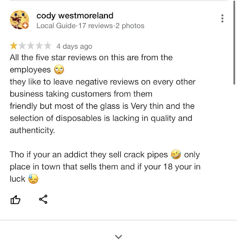 Read moreLet me start my review by saying I've spent a small fortune at this dump. Last week I bought two tobacco pipes that were priced at $9.99 each. When I got home I discovered that the young man, (who was very pleasant by the way) had charged me $14.99 for one of the pipes. He explained that he could give me a store credit but could not give me the cash back different which I was absolutely fine with.mr. Today I went back into the store to get my store credit and they told me I couldn't have a store credit until they talked to the young man now keep in mind I had everything in my hand proof that I've been overcharged What did they do through me out of the store Yes let me repeat they threw me out of the store I will never...
