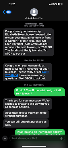 Read moreWell they will work with anyone else but my husband and then proceed to tell him how to pay his bills,this isnt the only thing and and we did give back most of their stuff cause they are way over priced and went to arrons who are actually way cheaper and odd things and missed payments and the balaced owed left on the account dosent seem like its off with arrons,its constantly like that with rent a center and i will call corporate since an employee who unknown to me untill the person who told me which was a relative and who lives with me that he knew him from years ago cause said employee and his friends tried to jump my brother!,and this employee has been to my house and he knew everytime he came who my brother was and he still diddnt tell his manager or anyone the situation and diddnt stop comming to my house so i supoose i will call corporate on this store because that is conflict of intrest especially sending an employee who has done something like that........and if they did know and still did it they need to be held accountable for continuing to do it because i could of called the cops,pretty sad because ive had relatives leave rent a center and go to arrons over the same thing not to mention they tried to sell us a used mattress which by the way is still illegal.............dont matter if its been cleand or not,i paid off a used bed set from rent first years ago and they even said its against the law to sell used mattress.......and a lawyer recently told me...