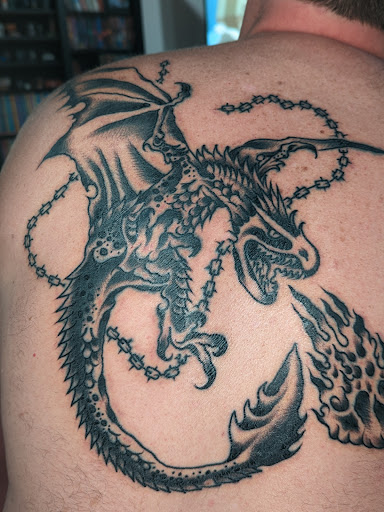 When my husband and I decided to finally get inked together we did a ton of research. We wanted a dragon(specifically a Hungarian Horntail from Harry Potter) We found this gorgeous gem of a tattoo shop. When we walked inside and was promptly greeted by Meg, she was very friendly and easy to talk to. We explained to her what we were thinking of getting and she gave us a suggestion on an artist that would fit what we wanted. After talking to Davy Broyles, and showing him what we'd like and discussing size and placement we set a date for our appointment. Davy absolutely blew us away. He was able to take the photo we sent and make it so much more. He made the whole experience calm but fun. He was very considerate when a break was needed. He even provided a snack for my husband halfway through his 3.5 hour session. (His spans a good portion of his back while mine is smaller on my shoulder.) Mine took a little over an hour. My niece and I have plans to head back and get something small together next year. Davy will be the artist we return to. I can't say enough great things about him. If you're thinking of getting a new tattoo be sure to...