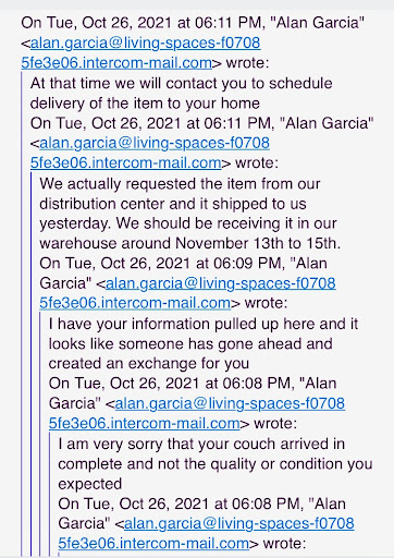 I went into the store and spent about two hours shopping for a couch. My partner and I finally decided on a couch, but needed to go home to measure the room to ensure it would fit comfortably. The sales person who helped me, Albert, set up the order for us so all we would have to do when we got home was pay for the order if the couch did fit the space. We get home, couch dimensions fit, we pay. The email we receive says it's going to be delivered in two weeks. Great! So two weeks goes by and on day 12 they say production of the couch is delayed another 2 weeks. Not the end of the world, but pretty annoying because at this point I had already sold my previous living room set leaving me with no furniture in my living room. So another two weeks goes by and I receive a call saying the couch is ready. YAY! - But wait, there's more. So, I call to schedule the delivery day. They tell me they would call me the next day to schedule the window of time it would be delivered. Never got the call and never got a response when I reached out. So they show up at 7am on a Sunday. I travel for work and am not home. My partner rushes over there only for them to have left 12 minutes earlier and tell him they will not turn around even though the couch is on the truck and they are still nearby. How courteous. So I call customer service. They proceed to tell me I now had to repay for the delivery service because I missed my original delivery time - mind you, the delivery time was never scheduled. So my partner has to go to the store in Millbrae- we live in SF, so this is pretty inconvenient. The customer service agent at the store was magically able to get the truck to come back the same day between 6pm - midnight. Not ideal being that he works early on Monday, but whatever. We just want the couch we paid for. So the delivery arrives around 8pm. We ordered a left arm sofa and a right side chaise. They delivered a left arm sofa and a left side chaise. How in the world it made it all the way through production without someone catching this is beyond me. So my partner refuses to sign for the chaise since it is the wrong piece. The delivery man gives him a bit of a hard time, but he has a job to do as well and this most certainly was not his fault. The delivery driver finally takes the incorrect piece back and leaves. So we then have to return to Millbrae AGAIN the next day because the customer service number is useless. We get to the store and explain to them how difficult it was to get help from the customer service line and they respond "oh yeah, they don't do anything. always just come in." - Like I have the time to just drop everything and drive over here for their mistakes. Cool. The in person staff were nice enough, but did absolutely nothing to accommodate such a big mistake the sales rep Albert had made. As I was explaining what had happened to the manager, he repeatedly spoke over me and dismissed what I had to say. I called him out and "please, you go ahead" - which I guess was his first recognition of him even treating me in such a way. He tells me to go ahead and say what I have to say. Thanks for the permission to let me speak. Extremely condescending and awful management. The staff had to send the right side chaise into production and said it would be expedited. That was a cute little lie. So anyways, two months later, we received the whole couch while getting no reimbursement, no store credit, and nothing more than an "I am sorry this happened" from Living Spaces for the huge mistake, untimely manufacturing, and complete disrespect. Do yourself a favor and just spend the extra money on a more...
