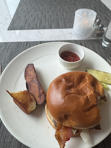 When seated, I was approached by a server who asked, âDo you have any questions?â without a greeting or introduction. I ordered the burger and a glass of wine. The wine was delivered promptly, but some was spilled on the table without acknowledgment. The burger was overcooked and came with two dry potato wedges. I took one bite of each and left the meal unfinished.