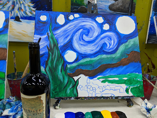My session was a 3 hour 'advanced' session painting Vincent Van Gogh's Starry Night. 3 hours went by quickly and you were allowed to stay for a bit afterwards to fine tune your painting. Sarah made everything easy so it wasn't 'advanced' difficult, but I think many of us got hooked into perfectionism...we started to spend time on blending in paints like a pro. This caused some of us to be a step or two behind. Or, it could be that the wine slowed us down just a tad 😊 That extra time afterwards was utilized by many.