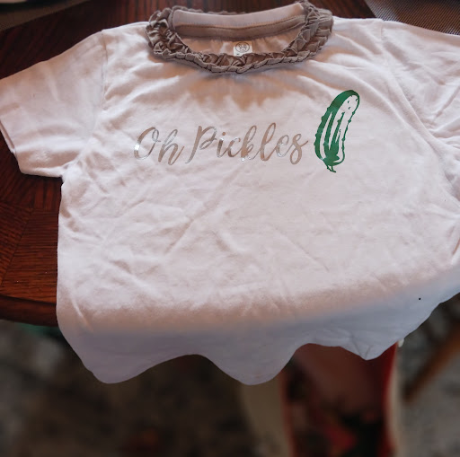 I was on vacation last week, and found this AMAZING boutique by accident- But I'm REALLY GLAD WE DID! My 4yr old daughter saw a dog outside, so of course we had to go see him! Turns out his name was PICKLES, and my daughter LOVES eating pickles! I then met the owner Christine, who is such an AMAZING person! I told her the pickle story and we started talking. She said that she could make my daughter a pickle shirt, and gave me her input on how she could make it! Well I'm GLAD that she did, because the shirt turned out PERFECT! I ALSO picked up a shirt for me, in support of Ukraine. It's now one of my favorites, and I wear it ALL THE TIME! Christine DONATES 100% of the money from these shirts, so I HIGHLY RECOMMEND getting one! She even took the time out of her day, to show and explain all the machines she had to me! I will now be going to her shop on each vacation to Erie, to get new shirts made for us again! And who doesn't LOVE to support a local small business?! Christine... You are the BEST!! And please don't mind the wrinkles, I just took it out of our suitcase! It was given to us in prefect...