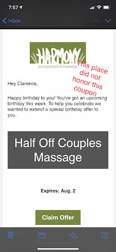 Read moreNot honoring a birthday coupon I received from Harmony Massage