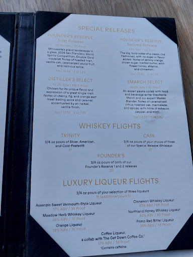 They have a number of whiskies and quite interesting. They use Minnesota oak barrels for aging. There is a "silver" unaged whiskey, a single malt whiskey, a cold-peated single malt, Brigid's First Batch, and several specialty batches. I recommend trying onr of their flights. Of the ones that we tried, Brigid's was the best.