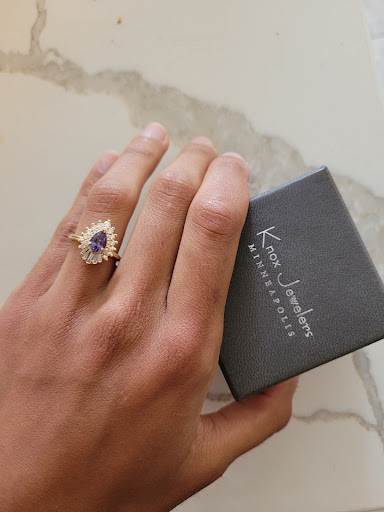 Things we particularly enjoyed: --Their selection of samples in store. As a visual person, I need to see things on my hand, against my skin color, and in different lighting to get a true sense of the ring/gem. Their selection of colored & colorless gemstones, metal types, and band examples were extremely helpful. --Very responsive by phone & email; communication was consistent and clear --Friendly, knowledgeable, helpful staff --Quick turnarounds - they helped us stay on production schedule (even though we had an accelerated timeline). Special shout-out to Kristin who helped our project stay on track when Emily was out of the office - another sign that Knox was dedicated to our project :) --They were very knowledgeable about “gemstone safety” - for my ring, they incorporated a bracket designed to protect my pear-shaped gem’s point (something that many designers shouldn't skip, but unfortunately do) --Photos shared during each step of the production process --Very comparable to non-custom prices we were finding (and this process was much more fun!)