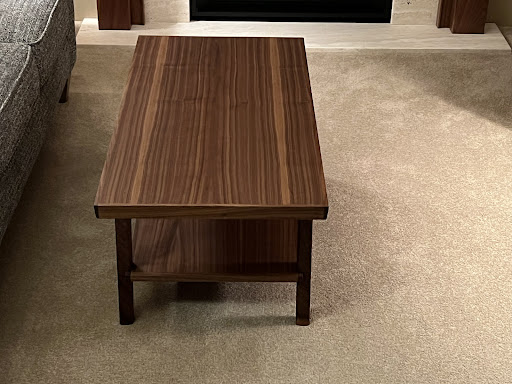 We are extremely happy with the coffee table Justin made for us. We had searched and searched for a table to fit in our room. Our space is rather small and everything we found was just too big. We made an appointment with Justin and he listened intently as we described what we were looking for. We brought pictures to show him what we liked. After discussing style, type of wood he sat down at his computer and drew up a plan. He tweaked his sketch and emailed us the table design. It was just what we wanted. As you can see from the photos it fits perfectly in size, design, wood type and tone....