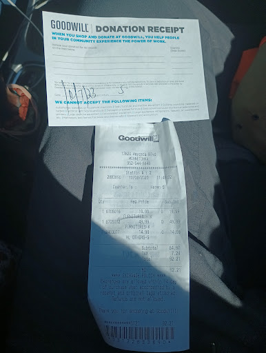 Read moreWe found a few furniture pieces we like and had just gotten done donating some other nice items get to the check out and about to pay and I can't find the coupon for 25% which would have saved us $25 on $100 purchase and it was the actual manager of this Minnetonka Goodwill that said well I'm sorry I can't help you and we had just got done donating a few hundred dollars worth of beautiful items we are told she had to follow the rules sorry and as we were in a hurry and I couldn't stand there and explain to her what was going on we paid the full price and left only to find the coupon from the donation drive-thru just 5 minutes afterwards. it just goes to show where these managers are at inside of a supposedly Good Samaritan store like Goodwill they have to win like that in life to get over on people and she had the gall to even ask us if we wanted to round up so Goodwill could donate that money to people in need . double standards and absolutely calling out the general manager and the manager that was on duty today at the Goodwill this morning. just remember the white office chair in the white corner desk and the trash basket the stainless steel one those people. . What's the fallacy called when one makes and changes rules for others yet adheres to none of them ever what's that fallacy...
