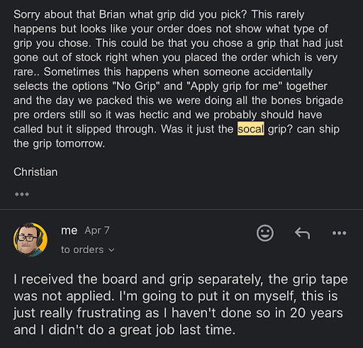 Not SoCal’s fault, but 2 days after I placed this order I happened to see the identical deck for the same price at a local shop that I ran across when out on the town. It would have been nice to know this local shop existed so I did not have to pay shipping, but I was happy that at least I was getting a deck that had done the worst part of building a board for me by having the special and fancy grip tape applied already for me.
