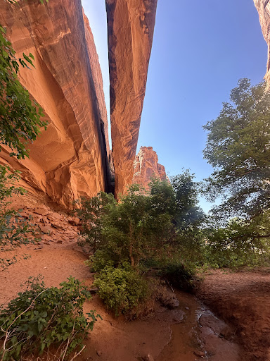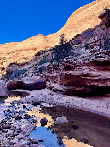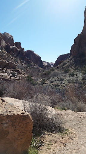 Great Trail. I've hiked it in August and February. In August, the cactus fruit are in bloom and the creek is a refreshing place to stick your feet or wet your bandana. Because of the creek, there is a lot of green and shade in the form of trees. It's like a scenic desert oasis. The canyon walls are a deep orange-red hue. In winter, it's not quite as scenic because of the lack of green, but still one of the best hikes within a short distance of Moab. It ends at a tall arch. I recommend hiking during the day, as the markings on the trail can be confusing at times. I've hiked it at night and didn't have major issues, but I could see how someone could. During the day it should be simple.