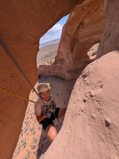 Kate was our guide for the day - we loved working with her! She was super laid-back, knowledgeable, and easy to talk to. Being that we've never been to Moab before, we didn't have a great sense of where we wanted to go for our rock climbing trip. Kate discussed our interests/abilities and offered to take us to her favorite climbing spots. We warmed up on a short climb on Wall Street, then she took us down the road to a really cool intro crack climb, and finally we drove out to Pocket Rocket for our last climb. We had a great time at all three locations, I can see why they are her favorite climbs! Kate is a fantastic guide and we felt completely safe on all the routes she brought us to. After we finished climbing she brought us to see some dinosaur tracks and petroglyphs, they were super cool to see up-close. Because we didn't have our own transportation and were staying just outside of the town, Kate was nice enough to offer to drop us off in town so we could walk around the 'main street' and have lunch at a local restaurant. It was nice to be able to see the town and get some non-hotel food! After lunch we met back up with Kate and she drove us out to Chamisa Canyon for some canyoneering. Our hike into Chamisa Canyon was super scenic, Kate pointed out local landmarks and taught us about the environment. We were lucky the water in the canyons was only about waist deep so we were able to carry our bags over our heads while we walked through. We wore fast-drying clothes so after we finished repelling and made it back to the van we were already pretty dry. I brought a change of clothes with me just incase but didn't end up needing it. Kate dropped us off at our hotel at the end of the day and gave us some advice on where to go for future climbs - again we were so happy to have pick up/drop off for this trip, it really wouldn't have been possible for us otherwise!