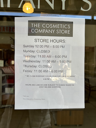 I have always loved the Cosmetics Company Store in the past, but this location is never open when the rest outlet mall is. I've tried to go to the Cosmetics Company Store at Premium Outlets 3-4 times in the past few months, each time on a Saturday afternoon when the outlet mall is open and busy. Every single time I have gone they are closed. Every time I approach the door, it is locked and there is a sign on it indicating some reason they are not able to open that day.