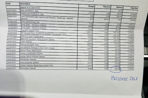 When I moved out I received a bill of $450. I did have a balance of $600 something odd dollars that I intended to pay whatever my security deposit ($500) didn’t cover. But they managed to tack on three hundred something more dollars. Nothing was broken or damaged in the apartment. These were “standard” fees. So be weary of that also.