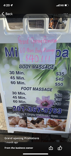 a "fairly" new establishment in town that i will NOT recommend. I go and have a massage once a month so I have been to a lot of places over Jersey and New York. I decided to check out over the weekend since its within walking distance to my place. They were accommodating and the massage started good. But when she started massaging my lower back it was very painful. I told her to lessen the pressure but she just kept on massaging with the same pressure. It was VERY painful to the point I was hissing in pain. I asked her again to lessen the pressure but she just told me that "it is okay, no pain no gain" and preceded to continue massaging. She only stopped when I stood up and asked to massage my feet instead. After, she had the gall to tell me to go back to her next time and do a 90-minute massage. This is not how you treat clients!!! First these are not licensed medical masseuse or doctors who would know if something is happening inside the body. The moment, the client has asked to stop or lessen the pressure, they should be concern as they dont know whether there is an injury or nerve/spinal damage. Now, i have more backache and shooting pains than when I went there, and will probably have to go to the doctor to see what is going on. I suggest never to get a back massage from them ever! They maybe a good foot massage place but they will injure your body and would not care about...