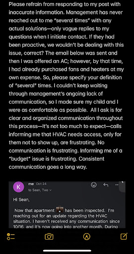 Read moreI posted 10 months ago about a significant rent increase on top of an ongoing leaking issue. I was filing paperwork for my business at the time, so I didn't want to disrupt this process by changing my home address. As a result, I ended up renewing the lease. The management did not offer help, and we did not find any resolution, as they commented in the previous review, trying to cover up.