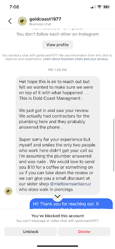 EDIT: Shortly after posting this, they found me on Instagram and reached out, apologizing and saying a plumber answered the phone, which in itself is pretty unprofessional if their contractors often answer their phone. Anyway they tried bribing me to take the review down by offering $10 in cash OR a 15% discount on a jewelry for a piercing at their sister store in Santa Cruz. I stopped replying for a few days but today they literally texted me three times asking me to delete this review. To be SO real I would be willing to accept a free piercing or at least a better bribe! But I decided their behavior has been incredibly unprofessional and quite sad. I hope that bribing isnāt a habit of theirs, but I will say that it would explain their high number of...