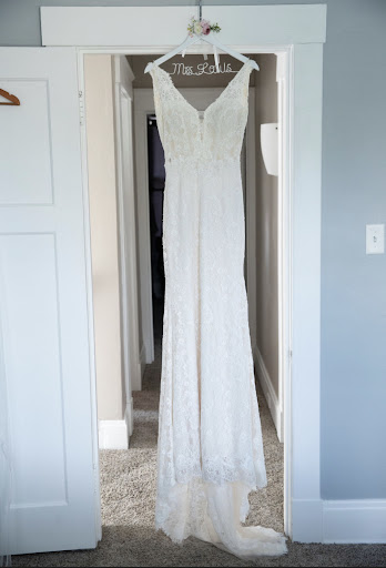 I went to Moji to get a quote on alterations for my wedding dress. It was full lace overlay with full scalloped hemline (see pictures below) and EXTREMELY detailed. I was worried about having to have alterations done at all but upon meeting Moji, I trusted her and knew she was the woman for the job! She took in the sleeves also so they would fit and did my bustle. I did dance way too hard with my dad and busted my bustle while dancing to "Bust A Move" (the irony is no lost on me!). But the length of my dress was my main concern and it was perfect.