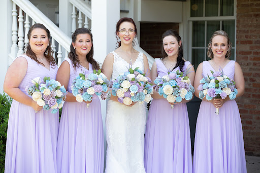 Pictures: me with bridesmaids (we all got alterations done by Moji); me and my husband so you can see the full length of the dress and all the detailed scallops; bridesmaid (and new sister!) who is the one that had her dress taken down about 1.5 sizes flawlessly....