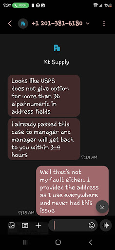 Package returned to sender due to invalid address. Text kt supply for a refund and was told that they would not refund me until they received and inspected the package they sent. Over a month had passed and I contacted them several times in which the rude customer service agent told me it is not their fault and it's solely on the customer for the address situation nor is it their fault if usps didn't get me the package. Only for me to finally get in contact with my local post office and they provided me with information showing that kt supply didn't print out my full address so that is why the package could not be delivered. Contacted kt supply today sending them a screenshot showing how I entered my address and letting them know it was their fault because of how they printed the label. No apology from them at all instead I get told that my address had too many characters for their label so part of my address was cut off. I stated weeks ago that I'd entered the right address and kt supply had the same information that I had and could have easily seen that they made a mistake but instead just wanted to be nasty and blame everything on me to avoid returning my money. Which is sad because I have been doing business with them for several years. And for them to not care about my issue or try to help me resolve anything is terrible. They never ever ever have to worry about me spending a dime with them ever again. Disgusting.