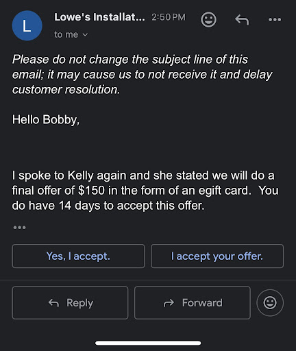 I received an email from the flooring manager offering me $100 egift card She said I would have to contact the installation dept to resolve the mater and get the gift card. I called and spoke to a different person (four different people I have spoken to). She said they were offering me the gift card only as a customer satisfaction gift. I told her itâs not the money I am after, but I do want a refund for the padding that was not used. I also asked her for an explanation why they lied in the first place and j wanted an apology. She stuck to her story and said they did not lie. I ask her should I believe them or my wife who witness them not taking up the existing padding. I then told her I had plans to take up a portion of the carpet just to prove they are lying. She said if you do that they will not be pay for it to be reinstalled. I said the court may see it differently. She said if I threatened her she could not talk to me any more. I told her this was not a threat, but a promise. Even with video proof they will not admit they are lying.
