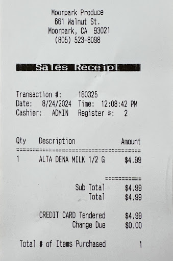 But when I went into Moorpark Produce I couldn’t believe the SUPER GOUGE prices. I needed some milk, and DID NOT SEE a price tag. Like a percentage of us, I did not look at the price before I casually (habitually) used my phone to pay electronically. When I got home, I noticed that a half gallon was FIVE CLAMS. Thats about 2.8 times Ralph’s price for the half gallon. I could have bought Ralph’s FULL GALLON for only $4. I felt like such an idiot for not checking the price. I would have left the milk right at the check stand. Not worth the effort to go return the unopened container. But I DID call them and let them know why I’m not going back there.