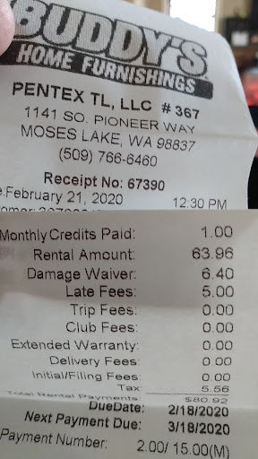 Read moreI have a washer and dryer, washer started leaking from the get go, called and realized they weren't going to do anything to fix it just like Aaron's. So far I've been on time with that payment for several months now. Added a Nintendo switch, but somehow I keep getting a late fee for it, and for some odd reason it won't process the same card. The owner called and I apologized for the inconvenience and I told her that that samething happened the previous month. So she said that she would waiver the late fee. I went in the next day like "I" told her I would and payed it. Turns out the late fee wasn't waived. So due to this lie, I am done with buddy's. Just like Aaron's lied after spending $3k on furniture I told them no more business. And after I pay off what I owe to buddy's you will never ever get my business again. You missed out on $5k worth of bed furniture cause I will be...
