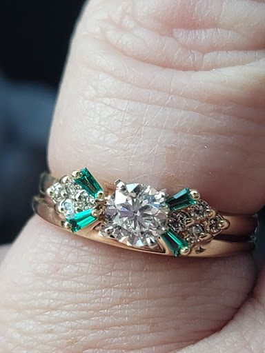 I can't say enough about this location!! I have not good about keeping up with my warranty checks on my wedding ring. I have had it since 2005. So many years of not being good on my warranty. Last time I went to this location for work on my set was also many years ago. I came in with a missing diamond in my enhancer. Last time I had to replace 2 of the diamonds because they were chipped (baguettes are good for that). Anyways, Randall was so polite and so patient while finding my information, so we could see what was covered or not covered. We found it, took a little bit, but he found it. I knew I needed to replace 2 if not all of those baguettes. We got to talking and I mentioned how I would love to replace the baguettes with emeralds instead of diamonds. I figured it would cost more the to do diamonds but I was wrong! So off my ring went to jeweler #1. All prongs were needing to be redone and that was still covered under my warranty even though I had not been god about going every 6 months. The jeweler said they couldn't get emeralds that small. What a bummer! Luckily, though, he chipped my solitaire Diamond during repair, yes I said luckily. Well that was found by another worker. So they ordered another diamond of BETTER quality and a smidge bigger in size that has a CERTIFICATION number in it! I didn't even know that was such a thing! Very cool to see that! Randall said let's send it off to a different jeweler this time and let's see about the emeralds with her. Well my ring just got done and I have everything I wanted and more. They went above and beyond for me and I can't wait to bring some more jewelry their way that I have warrant on. I also am going to be better about getting my jewelry checked every 6 months as well. I look forward to it. I forgot to mention how they remembered who I was after the first meeting! Super impressed!! Y'all are great and I am a very...