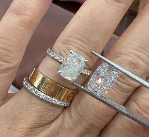Bo measured my moissanite stone and immediately went to the back to see what he could find. Just a few minutes later, he came out with the most gorgeous elongated cushion brilliant diamond in the exact same size as my moissanite! When I held them side by side, I knew instantly that I was going to buy it!!! It was so much clearer and sooooo much more sparkly (see photo below)!