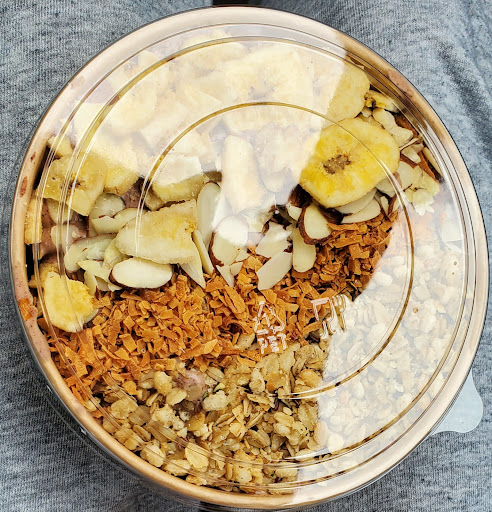 My daughter had the original Açaí bowl which contains frozen puree açai, fresh strawberries, almond slivers, toasted coconut and granola. I enjoyed the Choco-naner bowl. This bowl contains frozen puree açaí and bananas mixed with chocolate then topped with dried banana slices, almond slivers, toasted coconut and granola.