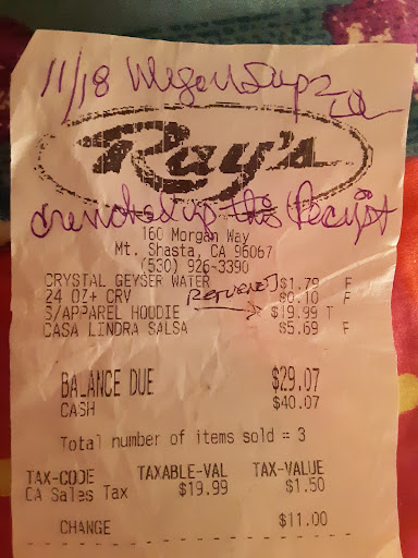 Read moreMy daughter-in-law is camping in the area and was thinking of relocating there. She went Ray's Food Place to get groceries and pick up cash from Western Union. She did her shopping and was then told to wait by the WU window. There was a sign that said closed, but she waited as she was told. Several employees were standing around, and a young man told her it was closed. She said, "Ok, I'm in no hurry. It says on your website that it's open until 9:00". It was 2:10. Again, the young man said, "There's a sign that says it's closed." Again, she said, "I'll wait; no problem." He raised his voice and yelled, "You'll be standing there waiting until 2:30 then" which brought everyone's attention to her. She put her groceries back, walked out, and called me crying. Is this a big deal? Well, my son-her husband and the love of her life- passed away recently. She's travelling alone trying to heal, and she finally found beautiful Shasta, and felt it could be her home. People who work with the public need to understand that kindness and respect matter. You don't know what a person is going through, and a small act like that can wreck someone who is experiencing trauma. Words matter. In just a few seconds, her world went from one of hope to despair. Please discuss customer service with...