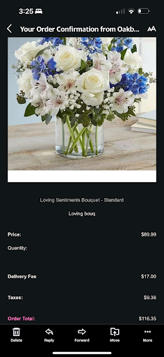 I wanted to give Oakbrook Florist the opportunity to clear things up before leaving a negative review, so I reached out via the e-mail address provided on their website the next day with my order details seeking any information [as I am busy at work during regular working hours and not able to easily make personal phone calls]. Even if I do receive an answer now, the one-time opportunity and reason for wanting to send flowers on the one specific day is in the past, but I thought they deserved a chance to explain what happened: I am not unreasonable, and I understand that emergencies and other exceptions arise. However, it has been over 24 hours and I have not heard anything back.