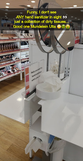 This picture was taken inside the Mundelein Ulta... Now in my opinion Ulta is generally a decent place to shop. They have great products and good promotions. However over the years I've noticed a decline in the appearance and overall "feel" of the establishment. For example, when I was here today... Employees were standing around looking at the shelves, doing absolutely Nothing, while the place was a Mess and didn't even offer to assist me, they actually took off in the opposite direction when I entered and came near their direction. There was no hand sanitizer in sight, and tissues everywhere. And it was DEAD in the store, and I had been inside for over 20 minutes, so it wasn't like they didn't have time to get to it. Just plain not caring and laziness... I would Never let a place I work for look like this. Doesn't matter how little I get paid, I have respect for others, and for myself above all else. Sephora would Never let their employees get away with this... Get...