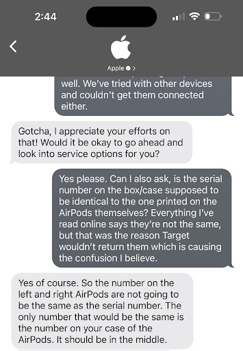 She checked the serial number on the case and box which matched. She then checked the serial numbers on the pods themselves, which don't match the case. She proceeded to berate us in front of customers, loudly exclaiming that "if these had been purchased here they WOULD have matching serial numbers". I told her she was wrong. She told us she wouldn't return them and to call Target customer service.