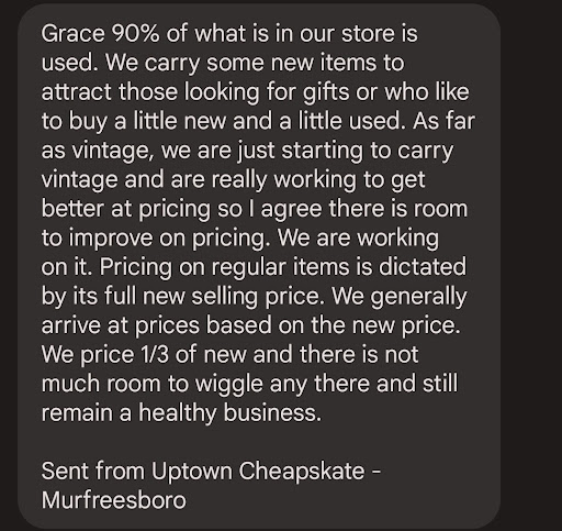 Read moreThe owner of this consignment shop is absolutely snooty and disrespectful, and her items are WAY over priced! I can buy new stuff for the same price that she has her used items priced for.