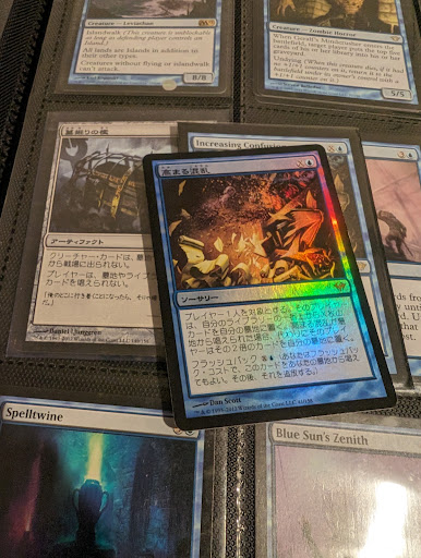 I've since scattered the cards into my collection at this point, but I pulled an interesting card within my first few days of playing the game, a Japanese Foil "Increasing Confusion" - I'll post a picture of it, he said "Oh that's cool!".