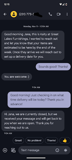 We never received any texts/calls besides one text on 11/11/24 saying we would get a call later that week which we did not, so my husband called sat 11/16, was given a delivery date of 11/20. When I called for an update this morning after replying to the original text on 11/11/24, they advised us we were texted through an automated system and called and a message left but because no response they cancelled our delivery . Nothing came through either of our phones besides the first text on 11/11/24. We are disappointed with the lack of communication and we were then told that one of the pieces had arrived damaged and now may not be able to have it delivered until 11/27/24.