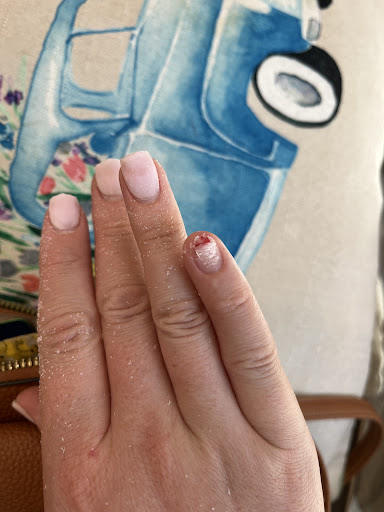 Read moreI’ve been getting my nails done for years. This place seems like they churn through a lot of customers. The technician I got was not experienced and very nervous. He cut me three times and himself badly twice. The photo I attached is because he split my nail underneath the tip then super glued the mistake to my skin before putting six layers of dip on top. What resulted was the dip and tip flipping upwards within four days and taking my entire mail and skin with it.