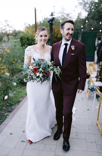 Jaime at Monkey Flower Group made the most beautiful bouquet for our December wedding. We chose silk flowers for the decorations but real, local, flowers for the bouquets/boutonnieres/corsages. I don't know how she did it, but Jaime chose these bright red gerber daises which were an EXACT match to the bright red shoes I wore. AND she got an EXACT match of ribbon for the boutonniere my groom wore to his suit. I recall sharing our color scheme with her, but still have no idea how she got those two details perfect. She is just AMAZING. And she was super transparent about the kind of available foliage in December (hint: it's not a lot of big blooms). We appreciate Jaime so much and could not...
