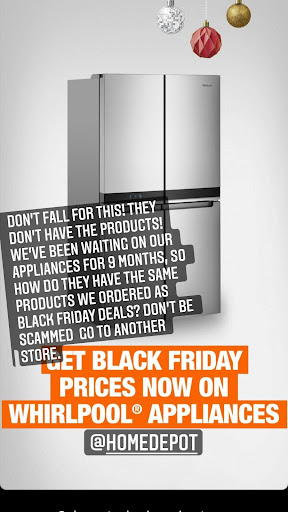Iām writing in regards to an appliance package deal that was all over Home Depot adds in May. We just had our 3rd child and were so excited to have a working dishwasher, refrigerator, oven, and microwave for all these dishes/bottles a family of 5 goes through. Well every month they have delayed it with an automated message to tell us it will be delayed, not even a person to talk to, to explain why. Mind you, the messages would come a day before delivery, so we had already cleaned the refrigerator and freezer out just to get another monthly disappointment. We have received 7 or 8 of these now. When we call to complain, we wait for hours on end. As a teacher trying to teach remote right now, I donāt have hours to get no answers from management. Finally, tonight as I am scrolling through social media, I see Home Depot has Whirlpool package deals again for Black Friday!?? They are a scam, because they do not end up delivering! After another 2 hour customer service wait time. The woman I talked to tonight from whirlpool said the microwave is not even being created and the package wonāt ship unless all are available. So I asked Home Depot if I can just get whatās in the store. She said, āno it must be delivered from whirlpool.ā I asked her what deal Home Depot can give us to make this right and she said they can not offer a deal until the delivery has been made. Yet, they just delayed it until Jan. How long must we wait? We even were willing to take the microwave that was back ordered off the order so it could ship. Sure enough it was delayed again, even after told it would work! 1 of the hours on hold ended with their employees fighting while I was on the line, completely unprofessional. A scam! So once it is delivered, if we donāt like their ādeal,ā it will be on our pocket to return deliver it? This is outrageous for a $297.13B company to be scamming tired moms who just want to have working appliances! I hope this story can help others choose alternate places to shop and large companies to stop pushing adds they can not deliver, literally. Thanks for listening to my rant, Happy Holidays and New Year ahead!! ā¤ļø Maybe one day our appliances will...